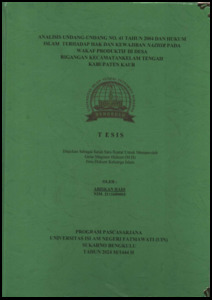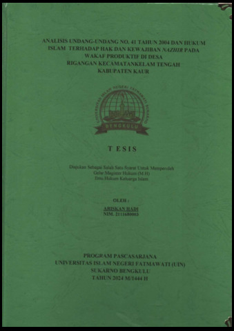 HADI, ARISKAM (2024) ANALISIS UNDANG-UNDANG NO. 41 TAHUN 2004 DAN HUKUM ISLAM TERHADAP HAK DAN KEWAJIBAN NAZHIR PADA WAKAF PRODUKTIF DI DESA RIGANGAN KECAMATANKELAM TENGAH KABUPATEN KAUR. Masters(S2) thesis, UIN FAS Bengkulu.
