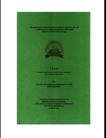 RAHMADANI, CHANIA MAGFIRAH SALIM (2024) PELAKSANAAN PUTUSAN PENGADILAN AGAMA KELAS 1A BENGKULU PERKARA HARTA BERSAMA NOMOR 340/Pdt.G/2021/PA.Bn. Masters(S2) thesis, UIN FAS Bengkulu.