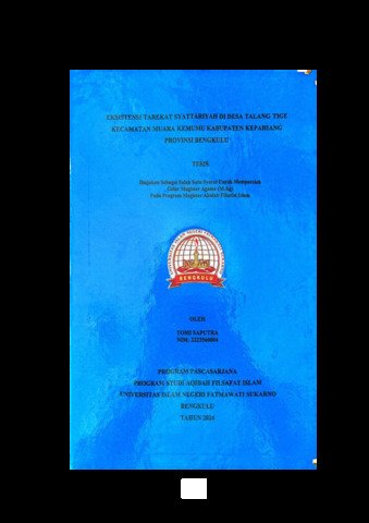 rumusan imasalah idalam ipenelitian ini iadalah : 1) Bagaimanai konsep ajaran itarekat syattariyahi di iDesa iTalang iTige? 2) Bagaimanai konsep ajaran tarekat syattariyah di Desa Talang Tige? 3) Apa saja faktor yang mendukung dan menghambat perkembangan tarekat syatariah di Desa Talang Tige? 4) Bagaimana kontribusi tarekat syatariah terhadap masyarakat desa Talang Tige? Penelitian ini menggunakan pendekatan field research dengan menggunakan metode kualitataif. Sumber data diperoleh dari para jamaah tarekat Syattariyah dan dokumen lainnya. Untuk mendapatkan hasil yang maksimal penelitiani ini imenggunakan iteknik ipengumpulan idata iberupa iobservasi, iwawancara dan idokumentasi. iTeknik ianalisis datai berupa ireduksi idata, ipenyajian idata serta iverifikasi/ikesimpulan. iHasil ipenelitian inii menyimpulkan ibahwa : 1) Masyarakat desa Talang Tige memahami bahwa tarekat syattariyah adalah suatu ibadah atau ajaran dalam menguatkan tauhid melalui pelatihan diri berupa amalan sesuai ajaran tarekat syattariyah, 2) Konsep ajaran tarekat syattariyah yaitu ba?iat, talqin, dan zikir yang dibaca secara jahar/jelas, 3) Salah satu faktor penghambat berkembangnya tarekat syattariyah di desa Talang Tige yaitu sedikitnya waktu para jemaah untuk mengikuti pengajian karena sibuk bekerja, 4) Melalui tarekat yang diajarkan oleh mursyid, mampu memberikan manfaat dan kontribusi tentang bagaimana melakukan pembersihan diri serta mengamalkan amalan yang menjadikan mereka mampu mengendalikan diri serta meninggalkan kebiasaan buruk yang dapat merugikan orang lain.