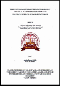 Permasalahan yang dibahas pada penelitian ini adalah apa saja ayat -ayat takaran dan timbangan dalam Al-Qur‟an dan bagaimana persepsi para pedagang sembako terhadap takaran dan timbangan. Tujuan dari penelitian ini adalah untuk mengetahui ayat-ayat takaran dan timbangan dalam Al-Qur‟an. Serta untuk mengetahui persepsi para pedagang sembako terhadap ayat-ayat takaran dan timbangan. Jenis Penelitian yang digunakan adalah penelitian lapangan ( field research ) dengan berbasis kajian pustaka dan metode pengolahan data yaitu metode kualitatif. Sumber primer menggunakan data dari lapangan. Sedangkan sumber data sekunder yang berhubungan dengan objek penelitian yaitu berupa refrensi dari buku, jurnal, skripsi, dan penunjang lainnya. Teknik pengumpulan data menggunakan observasi, wawancara dan dokumentasi. Hasil dari penelitian yang didapat peneliti adalah: 1). Dalam Al-Qur‟an terdapat 9 ayat yang membahas tentang takaran dan timbangan. 2). Beberapa diantara para pedagang sembako mengetahui ayat-ayat tentang takaran dan timbangan sebagian lagi ada yang tidak mengetahui. Persepsi para pedagang sembako terhadap ayat-ayat takaran dan timbangan adalah belum menerapkan serta melaksanakan anjuran dari ayat-ayat takaran dan timbangan agar tidak mengurangi takaran dan timbangan walaupun sekecil apapun.