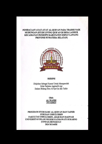 Wandi, Al (2024) PEMBACAAN AYAT-AYAT AL QUR’AN PADA TRADISI NAIK MUBUNGAN (STUDI LIVING QUR’AN DI DESA LANDUR KECAMATAN PENDOPO KABUPATEN EMPAT LAWANG PROVINSI SUMATERA SELATAN). Undergraduate(S1) thesis, UIN Fatmawati Sukarno Bengkulu.