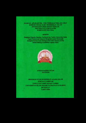 Putri, Anisah Rahma (2024) DAMPAK APLIKASI TIK – TOK TERHADAP PRILAKU SELF HARM DI TINJAU DARI PENDIDIKAN ISLAM (STUDI KASUS DESA DUSUN TENGAH KECAMATAN LUBUK SANDI KABUPATEN SELUMA). Undergraduate(S1) thesis, UIN Fatmawari Sukarno.