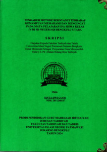 Permasalahan yang diangkat dalam penelitian ini mengenai tidak kreatif dalam menggunakan metode pembelajaran yang mengakibatkan rendahnya nilai mata Pelajaran IPA. Tujuan penelitian ini adalah untuk mengetahui apakah ada pengaruh penggunaan metode bernyanyi terhadap kemampuan mengingat dan memahami pelajaran IPA siswa kelas IV SD Negeri 028 Bengkulu Utara. Jenis penelitian yang digunakan adalah penelitian pre-eksperimental, sampel penelitian ini adalah siswa kelas IV SD Negeri 028 Bengkulu Utara yang berjumlah 20 orang. Teknik pengumpulan data menggunakan instrumen tes dan dokumentasi. Teknik analisis data yang digunakan adalah uji analisis dan uji hipotesis. Berdasarkan hasil penelitian yang dilakukan penulis di SD Negeri 028 Bengkulu Utara, maka dapat disimpulkan bahwa terdapat pengaruh penggunaan metode bernyanyi terhadap kemampuan mengingat dan memahami pelajaran IPA siswa kelas IV SD Negeri 028 Kota Bengkulu dengan nilai rata-rata 80. Hasil uji “t” pada post-test, untuk kemampuan memahami diperoleh thitung = 3,04, sedangkan ttabel dengan df 70 memiliki taraf signifikansi 5% yaitu 1. Dengan demikian, thitung > ttabel (3,04 > 1,998), yang berarti hipotesis kerja (Ha) dalam penelitian ini diterima, yaitu terdapat pengaruh penggunaan metode bernyanyi terhadap kemampuan memahami pelajaran IPA pada siswa kelas V SD Negeri 028 Bengkulu Utara. SD Negeri 028 Bengkulu Utara, Kemudian untuk kemampuan mengingat thitung = 6,666 sedangkan ttabel dengan df 70 memiliki taraf signifikansi 5% yaitu 1,994. Dengan demikian thitung = 2,86 sedangkan ttabel dengan df 70 memiliki taraf signifikansi 5% yaitu 1,994. Dengan demikian thitung > ttabel (2,86 > 1,9984) yang berarti hipotesis kerja (Ha) dalam penelitian ini diterima, yaitu terdapat pengaruh penggunaan metode bernyanyi terhadap kemampuan mengingat pelajaran IPA di SD Negeri 028 Kota Bengkulu Utara