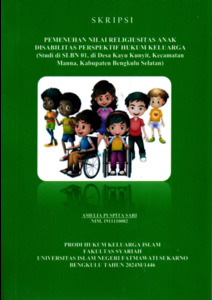 Dua persoalan yang dikaji dalam skripsi ini, yaitu: (1) Bagaimana praktek/pemenuhan hak anak berupa nilai religiusitas pada anak disabilitas di SLB Negeri 01 Manna Bengkulu Selatan. (2)Bagaimana tinjauan hukum keluarga terhadap pemenuhan hak anak berupa nilai religiusitas pada anak disabilitas di SLB Negeri 01 Manna Bengkulu Selatan. Adapun tujuan dari penelitian ini adalah untuk mengetahui bagaimana pemenuhan nilai religiusitas anak disabilitas di SLB Negeri 01 Manna Bengkulu Selatan dan untuk mengetahui tinjauan hukum keluarga tehadap pemenuhan nilai religiusitas pada anak disabilitas di SLB Negeri 01 Manna Bengkulu Selatan. Penulisan ini menggunakan metode deskriptif kualitatif yang bermanfaat untuk memberikan informasi, fakta dan data mengenai upaya pembimbing dalam mengembangkan keterampilan sosial anak Tunagrahita di SLB Negeri 01 Manna Bengkulu Selatan. Adapun hasil penelitian (1) Pemenuhan nilai religiusirtas pada anak disabilitas dan hubungan antara pemenuhan nilai religiusitas pada anak disabilitas (2) Tinjauan hukum keluarga terhadap pemenuhan hak anak berupa nilai religiusitas