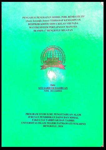 Hasibuan, Siti Sarifah (2024) PENGARUH PENERAPAN MODEL PJBL BERBASIS SSI (Socio Scientific Issues) TERHADAP KEMAMPUAN BERPIKIR KRITIS SISWA KELAS VIII PADA MATERI SISTEM PERNAPASAN MANUSIA DI SMPN 17 BENGKULU SELATAN. Undergraduate(S1) thesis, UIN Fatmawati Sukarno Bengkulu.