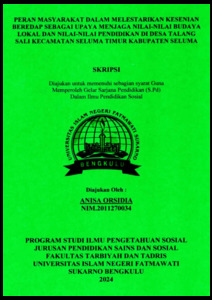 Dalam skripsi ini peneliti mengkaji peran masyarakat dalam melestarikan Seni Beredap dalam menjaga nilai-nilai budaya lokal dan nilai-nilai pendidikan di Desa Talang Sali Kecamatan Seluma Timur Kabupaten Seluma. Tradisi Seni Beredap yaitu merupakan suatu kesenian adat-istiadat turun-temurun dan diwariskan dari zaman nenek moyang yang ada di desa Talang Sali yang dimana diselenggaran ketika melakukan upacara pernikahan dan acara adat lainnya. Tradisi Seni Beredap tersebut merupakan suatu kesenian dimana yang merupakan suatu irama nyanyian para Nabi yang di perpadukan dengan beberapa pukulan irama dan di iringi oleh tarian adat. Tujuan dalam penelitian ini adalah untuk mengetahui proses pelaksanaan tradisi Seni Beredap dan peran masyarakat dalam melestarikan kesenian beredap sebagai menjaga nilai-nilai budaya lokal dan nilai-nilai pendidikan di Desa Talang Sali. penelitian ini merupakan jenis penelitian kualitatif dengan pendekatan dekriptif kualitatit. Sebagai alat pendukung, penulis dalam penelitian ini menggunakan metode wawancara, dokumentasi, dan observasi. Hasil dari penelitian ini adalah mengetahui proses pelaksanaan tardisi Seni Beredap, pada prosesi perkawinan, tradisi ini dilaksanakan setelah perkawinan. Nilai pendidikan yang terdapat dalam tradisi Seni Beredap yaitu kebersamaan, tanggung jawab, keserasian hidup dan kerjasama masyarakat di Desa Talang Sali.