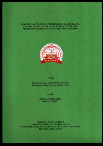 Weli, Budiman Sepri (2024) PRAKTIK HAK IJBAR WALI NIKAH DI DESA PASAR SELUMA KECAMATAN SELUMA SELATAN KEBUPATEN SELUMA PERSPEKTIF FIQIH KLASIK DAN FIQIH KONTEMPORER. Masters(S2) thesis, UIN Fatmawati Sukarno Bengkulu.