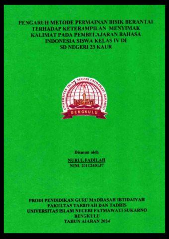 Penelitian ini bertujuan untuk mengetahui bagaimana pengaruh penggunaan metode permainan bisik berantai terhadap keterampilan menyimak Kalimat Pada Pembelajaran Bahasa Indonesia siswa kelas IV SD Negeri 23 Kaur. Tujuan Penelitian Bertujuan untuk mendeskripsikan Pengaruh Penggunaan metode permainan bisik berantai terhadap keterampilan menyimak Kalimat Pada Pembelajaran bahasa Indonesia terhadap siswa kelas IV SD Negeri 23 Kaur.Jenis penelitian yang saya gunakan adalah penelitian kuantitatif dengan pendekatan eksperimen (Quasi Ekprimental Design). Penelitian eksperimental merupakan metode yang paling banyak dipilih dan paling produktif dalam penelitian. Bila dilakukan dengan baik, studi eksperimental menghasilkan bukti yang paling benar terkait dengan hubungan sebab akibat. Setelah proses pembelajaran dilaksanakan, siswa diberikan tes untuk mengukur keterampilan dalam menyimak kalimat. Rata-rata posttest pada kelas IVB (Eskprimen) nilai minimumnya 40 sedangkan nilai maksimumnya 90, dengan rata�rata (mean) sebesar 70,5000 sedangkan rata-rata posttest pada kelas IVA (Kontrol) adalah dengan nilai minimumnya 30 sedangkan nilai maksimumnya 90. nya 90, rata-rata (mean) sebesar 57,0000,. Data tersebut dapat dilihat pada halaman. Terdapat pengaruh metode permainan bisik berantai siswa kelas IV yang diajarkan dengan menggunakan metode permainan bahasa bisik berantai terhadap keterampilan menyimak kalimat lebih efektif daripada pada siswa yang diajarkan dengan menggunakan metode ceramah dalam menyimak kalimat di SD Negeri 23 Kaur. Dibuktikan dengan nilai rata-rata hasil tes kelas IVB (Eksprimen) lebih tinggi dibandingkan kelas IVA (Kontol).
