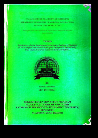 Rado, Joerdi Eldo (2024) AN ANALYSIS OF TEACHER’S QUESTIONING STRATEGIES DURING THE CLASSROOM INTERACTION AT SMPN 14 BENGKULU CITY (Descriptive Study On Eight Grade At SMPN 14 kota Bengkulu In Academic Year 2023/2024). Undergraduate(S1) thesis, UIN Fatmawati Sukarno Bengkulu.