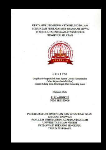 Ahdikin, Piri (2024) UPAYA GURU BIMBINGAN KONSELING DALAM MENGATASI PERILAKU SEKS PRANIKAH SISWA DI SEKOLAH MENENGAH ATAS NEGERI 6 BENGKULU SELATAN. Undergraduate(S1) thesis, UIN Fatmawati Sukarno Bengkulu.