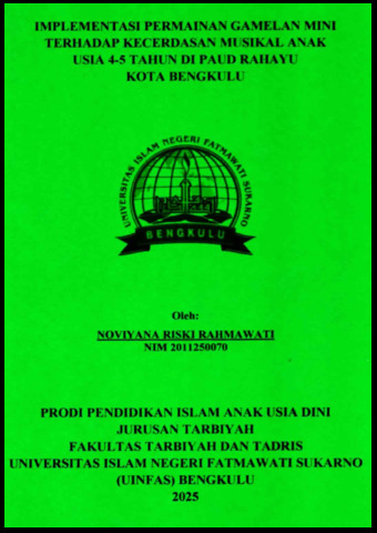 RAHMAWATI, NOVIYANA RISKI (2024) IMPLEMENTASI PERMAINAN GAMELAN MINI TERHADAP KECERDASAN MUSIKAL ANAK USIA 4-5 TAHUN DI PAUD RAHAYU KOTA BENGKULU. Undergraduate(S1) thesis, UIN FATMAWATI SUKARNO BENGKULU.