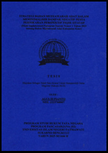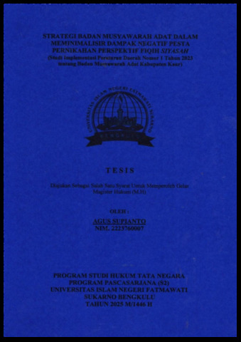 Supianto, Agus (2025) ii STRATEGI BADAN MUSYAWARAH ADAT DALAM MEMINIMALISIR DAMPAK NEGATIF PESTA PERNIKAHAN PERSPEKTIF FIQIH SIYASAH (Studi Implementasi Peraturan Daerah Nomor 1 Tahun 2023 tentang Badan Musyawarah Adat Kabupaten Kaur). Undergraduate (S1) thesis, UIN Fatmawati Sukarno Bengkulu.