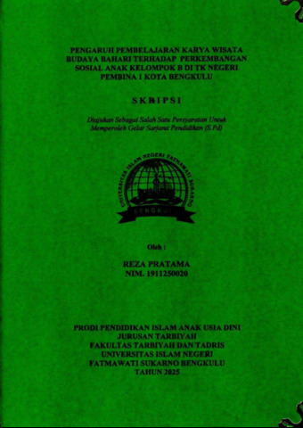 Pratama, Reza (2025) PENGARUH PEMBELAJARAN KARYA WISATA BUDAYA BAHARI TERHADAP PERKEMBANGAN SOSIAL ANAK KELOMPOK B DI TK NEGERI PEMBINA 1 KOTA BENGKULU. Undergraduate (S1) thesis, UIN Fatmawati Sukarno Bengkulu.