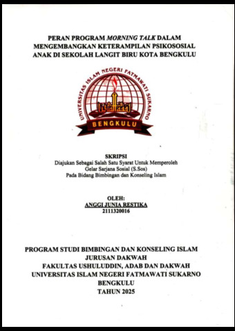 Restika, Anggi Junia (2025) PERAN PROGRAM MORNING TALK DALAM MENGEMBANGKAN KETERAMPILAN PSIKOSOSIAL ANAK DI SEKOLAH LANGIT BIRU KOTA BENGKULU. Undergraduate (S1) thesis, UIN Fatmawati Sukarno Bengkulu.