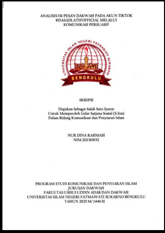 Rahmah, Nur Dina (2025) ANALISIS ISI PESAN DAKWAH PADA AKUN TIKTOK @DASADLATIFOFFICIAL MELALUI KOMUNIKASI PERSUASIF. Undergraduate (S1) thesis, UIN Fatmawati Sukarno Bengkulu.