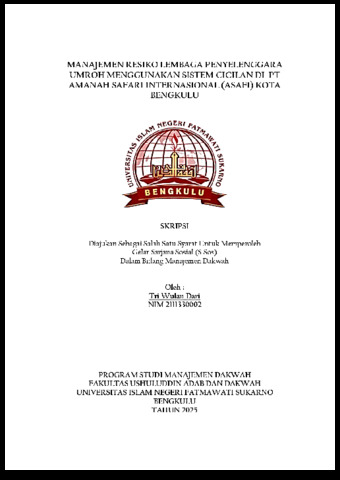 Dari, Tri Wulan (2024) MANAJEMEN RESIKO LEMBAGA PENYELENGGARA UMROH MENGGUNAKAN SISTEM CICILAN DI PT AMANAH SAFARI INTERNASIONAL (ASAFI) KOTA BENGKULU. Undergraduate (S1) thesis, UIN Fatmawati Sukarno Bengkulu.