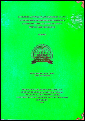 Skripsi ini membahas tentang efektivitas penggunaan geogebra dalam meningkatkan kemampuan pemahaman konsep siswa di SMPN 18 Kota Bengkulu. Penelitian ini bertujuan Untuk mengetahui efektivitas penggunaan aplikasi geogebra dalam meningkatkan kemampuan pemahaman konsep matematis siswa di SMPN 18 Kota Bengkulu. Jenis penelitian yang digunakan adalah Quasi Eksperimen. Teknik pengambilan sampel pada penelitian ini adalah Simple Random Sampling. Data diperoleh melalui observasi, tes, dan dokumentasi kemudian diolah menggunakan statistik deskriptif dan statistik inferensial. Hasil penenlitian menunjukkan bahwa adanya perbedaan rata-rata hasil posttest siswa pada kedua kelas yang ditunjukkan dengan nilai sig pada Uji Indpendent Sample Test yaitu sebesar 0.008 > 0.05 yang berarti terdapat perbedaan antara rata-rata hasil postes kedua kelas. Kemudian dilakukan uji N-Gain, diperoleh nilai N-Gain skor sebesar 56.43% dengan tinggkat keefektifan Cukup Efektif. Maka dapat dinyatakan bahwa H0 ditolak dan H1 diterima yang berarti penggunaan Geogebra efektif digunakan untuk meningkatkan kemampuan pemahaman konsep siswa pada materi hubungan antar sudut di kelas VII SMPN 18 Kota Bengkulu.