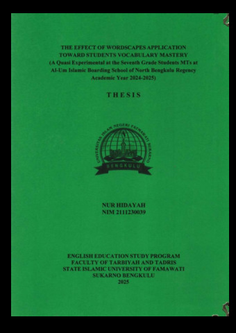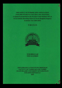HIDAYAH, NUR (2025) THE EFFECT OF WORDSCAPES APPLICATION TOWARD STUDENTS VOCABULARY MASTERY (A Quasi Experimental at the Seventh Grade Students MTs at Al-Um Islamic Boarding School of North Bengkulu Regency Academic Year 2024-2025). Undergraduate (S1) thesis, UIN Fatmawati Sukarno Bengkulu.