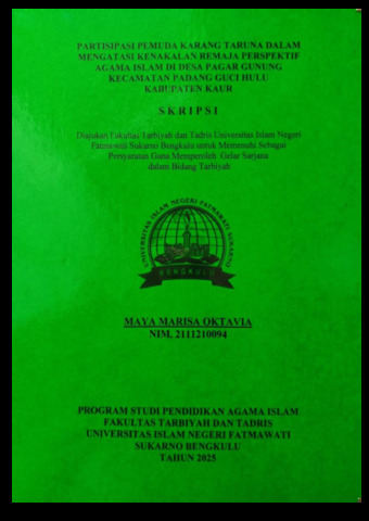 Oktavia, Maya Marisa (2025) Partisipasi pemuda Karangtaruna dalam mengatasi kenakalan remaja perspektif agama islam di desa pagar gunung kecamatan padang guci hulu kabupaten kaur. Undergraduate (S1) thesis, UIN Fatmawati Sukarno Bengkulu.