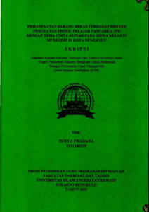 x ABSTRAK SURYA PRADANA : Pemanfaatan Barang Bekas Terhadap Proyek Penguatan Profil Pelajar Pancasila Dengan Tema Cinta Rupiah Pada Siswa Kelas IV SDN 81 Kota Bengkulu. Penelitian ini dilatarbelakangi oleh penerapan Proyek Penguatan Profil Pelajar Pancasila (P5) di SD 81 Bengkulu, salah satu proyek yang dilakukan yaitu pemanfaatan barang bekas Dengan Tema Cinta Rupiah. Hal ini berkaitan dengan permasalahan lingkungan di masyarakat, khususnya masih banyaknya sampah yang dibuang sembarangan, dibakar, atau menumpuk tanpa pengelolaan yang tepat. Penelitian ini dilaksanakan di SD 81 Bengkulu pada semester genap tahun ajaran 2024/2025. Tujuan dari penelitian ini adalah untuk mengetahui: (1) Pemanfaatan Barang Bekas Dalam Proyek P5 Dengan Tema Cinta Rupiah Pada Siswa Kelas IV; (2) Mengetahui manfaat dari poyek Pemanfaatan Barang Bekas Dengan Tema Cinta Rupiah; dan (3) Kendala yang dihadapi dalam pelaksanaan Proyek P5 Pemanfaatan Barang Bekas dengan Tema Cinta Rupiah. Metode yang digunakan dalam penelitian ini adalah pendekatan kualitatif dengan jenis penelitian lapangan (field research). Subjek penelitian terdiri dari kepala sekolah, wakil kepala bidang kurikulum, guru kelas IV, dan beberapa siswa kelas IV di SD 81 Bengkulu. Teknik pengumpulan data dilakukan melalui observasi, wawancara, dan dokumentasi. Data dianalisis melalui tahapan reduksi data, penyajian data, dan penarikan kesimpulan. Keabsahan data diperiksa melalui triangulasi teknik dan sumber. Hasil penelitian menunjukkan bahwa: (1) Proses pemanfaatan barang bekas dalam implementasi P5 meliputi tahap perencanaan, persiapan, pelaksanaan, dan evaluasi; (2) Manfaat dari proyek pemanfaatan barang bekas ini menanamkan kepada pesertadidik rasa cinta terhadap lingkungan dan identitas bangsa xi salahsatunya cinta rupiah; dan (3) Kendalanya diantaranya dari orangtua lingkungan ,dan ketersediaan barang bekas serta kreativitas yang dari siswa yang berbeda beda.