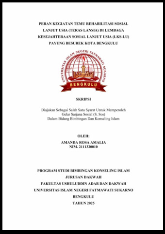 AMALIA, AMANDA ROSA (2025) PERAN KEGIATAN TEMU REHABILITASI SOSIAL LANJUT USIA (TERAS LANSIA) DI LEMBAGA KESEJAHTERAAN SOSIAL LANJUT USIA (LKS-LU) PAYUNG BESUREK KOTA BENGKULU. Undergraduate (S1) thesis, UIN Fatmawati Sukarno Bengkulu.
