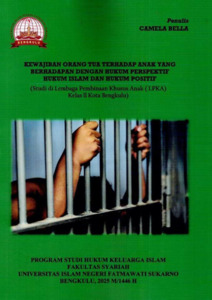 ix ABSTRAK KEWAJIBAN ORANG TUA TERHADAP ANAK YANG BERHADAPAN DENGAN HUKUM PERSPEKTIF HUKUM ISLAM DAN HUKUM POSITIF (Studi di Lembaga Pembinaan Khusus Anak ( LPKA) Kota Bengkulu Oleh: Camela Bella Nim: 211111000 Penelitian ini membahas kewajiban orang tua terhadap anak yang berhadapan dengan hukum dalam perspektif hukum Islam dan hukum positif, dengan studi di Lembaga Pembinaan Khusus Anak Kelas II Kota Bengkulu. Metode yang digunakan adalah kualitatif deskriptif melalui wawancara, observasi, dan dokumentasi terhadap anak binaan, orang tua, petugas lembaga, dan pendamping dari instansi terkait. Hasil penelitian menunjukkan bahwa sebagian orang tua sudah menjalankan kewajibannya, seperti memberi nafkah, memelihara, dan mendidik anak ,hal tersebut sudah sesuai dengan hukum Islam dan positif. Namun, ada pula yang hanya menjalankannya secara tidak teratur akibat kendala geografis dan ekonomi, meskipun upaya tersebut telah sesuai dengan hukum Islam dan hukum positif. Sementara itu, terdapat juga orang tua yang sama sekali tidak pernah berkunjung atau memberikan nafkah, pemeliharaan, dan pendidikan, yang belum sesuai dengan kedua sistem hukum tersebut. Dalam hukum Islam, kewajiban orang tua tetap wajib di laksanakan, sedangkan dalam hukum positif diatur dalam Kompilasi Hukum Islam, Undang-Undang No 1 tahun 1974 tentang perkawinan,Perlindungan Anak dan Penelitian ini merekomendasikan peningkatan peran aktif orang tua dalam mendampingi proses pembinaan anak di Lembaga Pembinaan Khusus Anak.
