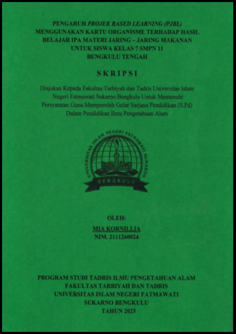 KORNILIA, MIA (2025) PENGARUH PROJEK BASED LEARNING (PJBL) MENGGUNAKAN KARTU ORGANISME TERHADAP HASIL BELAJAR IPA MATERI JARING – JARING MAKANAN UNTUK SISWA KELAS 7 SMPN 11 BENGKULU TENGAH SKRIPSI. Undergraduate (S1) thesis, UIN Fatmawati Sukarno Bengkulu.