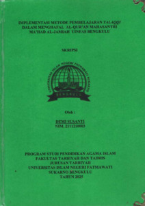 SUSANTI, DEMI (2025) IMPLEMENTASI METODE PEMBELAJARAN TALAQQI DALAM MENGHAFAL AL-QUR’AN MAHASANTRI MA’HAD AL-JAMIAH UINFAS BENGKULU. Undergraduate (S1) thesis, UIN Fatmawati Sukarno Bengkulu.