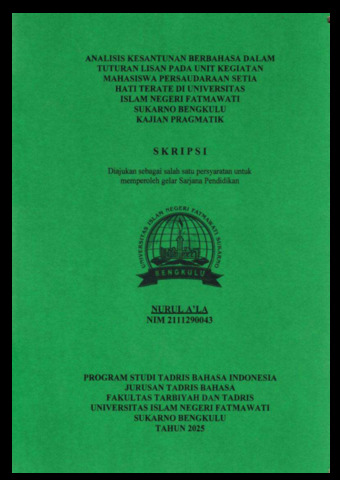 A’LA, NURUL (2025) ANALISIS KESANTUNAN BERBAHASA DALAM TUTURAN LISAN PADA UNIT KEGIATAN MAHASISWA PERSAUDARAAN SETIA HATI TERATE DI UNIVERSITAS ISLAM NEGERI FATMAWATI SUKARNO BENGKULU KAJIAN PRAGMATIK. Undergraduate (S1) thesis, UIN Fatmawati Sukarno Bengkulu.