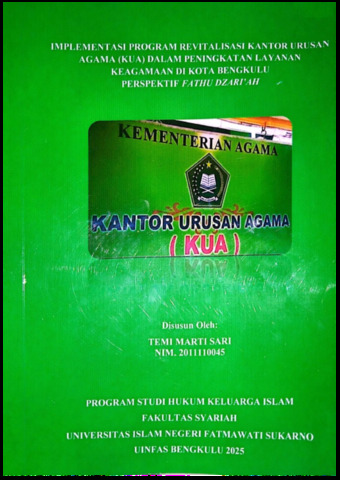 Sari, Temi Marti (2025) IMPLEMENTASI PROGRAM REVITALISASI KANTOR URUSAN AGAMA (KUA) DALAM PENINGKATAN LAYANAN KEAGAMAAN DI KOTA BENGKULU PERSPEKTIF FATHU DZARI’AH. Undergraduate (S1) thesis, UIN Fatmawati Sukarno Bengkulu.