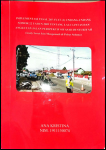Skripsi ini mengkaji permasalahan peningkatan angka kecelakaan lalu lintas dari tahun ke tahun menunjukkan bahwa kurangnya kesadaran masyarakat tentang budaya tertib berkendara. SIM adalah salah satu syarat sehingga penerapan hukum terhadap pengendara sepeda motor yang tidak mempuyai Surat Izin mengemudi (SIM) dalam berkendaraan adalah hal yang sangat serius agar peningkatan kecelakaan lalu lintas dapat dihindarkan. Rumusan masalah yang dikaji dalam Skripsi ini yaitu, 1. Bagaimana penerapan hukum terhadap pengendara sepeda motor yang tidak mempuyai Surat Izin mengemudi (SIM) dalam berkendaraan? 2. Bagaimana penerapan hukum terhadap pengendara sepeda motor yang tidak mempuyai Surat Izin mengemudi (SIM) dalam berkendaraan perspektif siyasah dusturiyah?. Metode penelitian yang digunakan dalam penelitian ini adalah penelitian lapangan (field reseacrh). Hasil penelitiannya yaitu,1. Penerapan hukum terhadap pengendara sepeda motor yang tidak mempuyai Surat Izin mengemudi (SIM) dalam berkendaraan bahwa Masyarakat harus mulai menghargai peraturan dan hak pengguna jalan yang lain, disisi lain polisi juga harus mampu mereformasi diri sehingga lebih akuntabel, transparan dan tidak terkesan memanfaatkan undang-undang atau peraturan untuk meraih keuntungan 2. bahwa Pasal 265 Ayat (1) UndangUndang Nomor 22 Tahun 2009 Tentang Surat Izin Mengemudi (Sim), akan terimplemtasi secara baik jika adanya suatu kesadaran dari pengemudi bermotor untuk memiliki SIM ketika akan berkendara dan juga petugas polisi dengan giat melakukan sidak/razia pengemudi yang tidak memiliki SIM dan juga dengan mempermudah pembuatan SIM sehingga terciptanya masyarakat yang terlindungi dalam berkendara dan ketertiban berlalu lintas dapat dicapai.