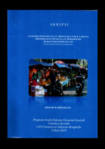 Tujuan penelitian ini adalah : Pertama, untuk mengetahui pemanfaatan trotoar untuk promosi dan penjualan di Jalan Salak Kota Bengkulu. Kedua, untuk mengetahui strategi tinjauan hukum ekonomi Islam terhadap pemanfaatan trotoar sebagai tempat promosi dan penjualan di Jalan Salak Kota Bengkulu. Penulis menggunakan metode penelitian deskriptif kualitatif. Hasil penelitian ini dapat disimpulkan: Pertama, Trotoar di Jalan Salak Kota Bengkulu belum berfungsi sesuai dengan aturan perundang-undangan yang berlaku baik Undangundang No 38 tahun 2004 tetang Jalan maupun Perdirjen Binamarga tentang Jalan . Hak kenyamanan dan keamanan pejalan kaki terganggu oleh papan reklame yang dipasang di trotoar jalan membahayakan orang lain dan perjalanan terhalang oleh barang dagangan. Trotoar di Jalan Salak Kota Bengkulu masih digunakan oleh pedagang untuk kegiatan promosi dan penjualan, dengan alasan menjadi lokasi yang strategis untuk berjualan, karena mudah dijangkau pembeli. Selain itu, memajangkan barang dagangan di trotoar memudahkan pembeli untuk memilih barang yang dicari tanpa harus masuk ke toko, hemat biaya sewa toko dan memudahkan pembeli untuk berbelanja. Kedua, kegiatan promosi dan penjualan yang dilaksanakan di trotoar menyebabkan terganggunya hak pejalan kaki untuk berjalan dengan nyaman dan lancar. Selain itu, banyaknya reklame di trotoar bisa mengancam keselamatan pejalan kaki. Seringnya Kota Bengkulu dilanda badai dapat menyebabkan papan reklame roboh dan menimpa pejalan kaki atau kendaraan yang melintas. Jika ada manfaatnya, yang merasakan hanya sebagian orang saja yaitu penjual. Karena itu, praktik penggunaan trotoar untuk kegiatan promosi dan penjualan di Jalan Salak tidak dibenarkan menurut kajian ekonomi syari’ah karena dapat membahayakan orang, mengganggu pejalan kaki dan merubah fungsi trotoar sebagai fasilitas umum.