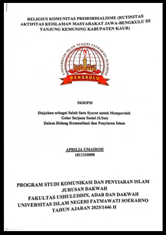 Umairoh, Aprilia (2025) RELIGIUS KOMUNITAS PRIMORDIALISME (RUTINITAS AKTIFITAS KEISLAMAN MASYARAKAT JAWA-BENGKULU DI TANJUNG KEMUNING KABUPATEN KAUR). Undergraduate (S1) thesis, UIN Fatmawati Sukarno Bengkulu.