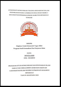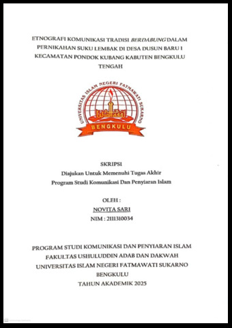 SARI, NOVITA (2025) ETNOGRAFI KOMUNIKASI TRADISI BERDABUNG DALAM PERNIKAHAN SUKU LEMBAK DI DESA DUSUN BARU 1 KECAMATAN PONDOK KUBANG KABUTEN BENGKULU TENGAH. Undergraduate (S1) thesis, UIN Fatmawati Sukarno Bengkulu.