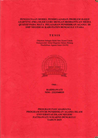 RAHMAWATI, RAHMAWATI (2025) PENGGUNAAN MODEL PEMBELAJARAN PROBLEM BASED LEARNING (PBL) OLEH GURU DENGAN BERBANTUAN MEDIA QUIZIZZ PADA MATA PELAJARAN PENDIDIKAN AGAMA DI SMP NEGERI 61 KABUPATEN BENGKULU UTARA. Undergraduate (S1) thesis, UIN Fatmawati Sukarno Bengkulu.