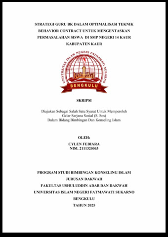 FEBIARA, CYLEN (2025) STRATEGI GURU BK DALAM OPTIMALISASI TEKNIK BEHAVIOR CONTRACT UNTUK MENGENTASKAN PERMASALAHAN SISWA DI SMP NEGERI 14 KAUR KABUPATEN KAUR. Undergraduate (S1) thesis, UIN Fatmawati Sukarno Bengkulu.