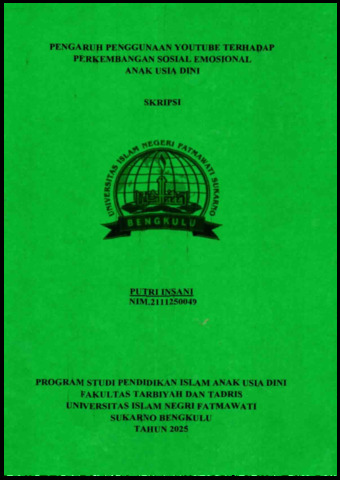 iInsani, Putri (2025) PENGARUH PENGGUNAAN YOUTUBE TERHADAP PERKEMBANGAN SOSIAL EMOSIONAL ANAK USIA DINI. Undergraduate (S1) thesis, UIN Fatmawati Sukarno Bengkulu.