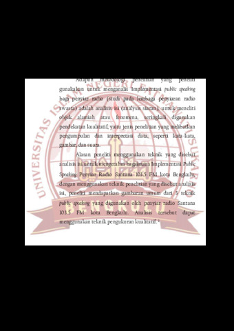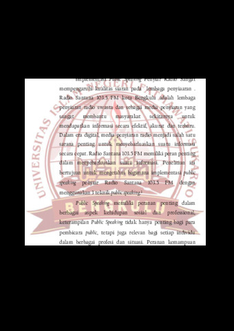 Rumusan masalah penelitian ini adalah: bagaimana implementasi public speaking penyiar radio Santana 103.5 FM kota Bengkulu dengan menggunakan 3 teknik public speaking. Penelitian ini menggunakan metode deskriptif kualitatif, dengan menggunakan teknik analisis isi (analisis isi siaran), informan dalam penelitian ini adalah penyiar radio Santana 103.5 FM kota Bengkulu. Hasil penelitian ini adalah bahwa penyiar radio Santana 103.5 FM kota Bengkulu telah mengimplementasikan 3 teknik public speaking penyiar diantaranya: a. Teknik 5W + 1