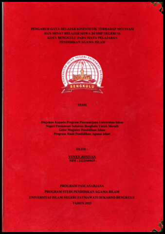 JONIVAN, YOVEN (2025) PENGARUH GAYA BELAJAR KINESTETIK TERHADAP MOTIVASI DAN MINAT BELAJAR SISWA DI SMP NEGERI 16 KOTA BENGKULU PADA MATA PELAJARAN PENDIDIKAN AGAMA ISLAM. Magister (S2) thesis, UIN Fatmawati Sukarno Bengkulu.