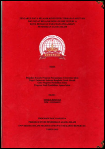 Penelitian dalam tesis ini dilatar belakangi oleh pentingnya gaya belajar dalam kegiatan belaja mengajar. Gaya belajar pada umumnya dibagi menjadi tiga yaitu, gaya belajar visual, gaya belajar auditorial, dan gaya belajar kinestetik. Namun, dari ketiga gaya belajar tersebut hanya satu gaya belajar yang mendominasi pada setiap individu. Pada penelitian ini berfokus pada gaya belajar kinestetik yaitu gaya belajar yang berorientasi pada fisik dan banyak bergerak. Tujuan penelitian ini ialah untuk mengetahui apakah ada pengaruh gaya belajar kinestetik terhadap motivasi dan minat belajar siswa di SMPN 16 kota Bengkulu. Jenis penelitian ini adalah penelitian lapangan dengan pendekatan kuantitatif asosiatif. Jumlah sampel 68 responden dan teknik pengumpulan data yang digunakan adalah observasi, dokumentasi dan angket. Uji hipotesis dengan menggunakan analisis regresi sederhana dan berganda. Hasil penelitian mengenai pengaruh gaya belajar kinestetik terhadap motivasi dan minat belajar siswa SMPN 16 Kota Bengkulu pada mata pelajaran pendidikan agama Islam yaitu adanya pengaruh yang signifikan antara gaya belajar kinestetik terhadap motivasi dan minat belajar siswa SMPN 16 Kota Bengkulu pada mata pelajaran pendidikan agama Islam.