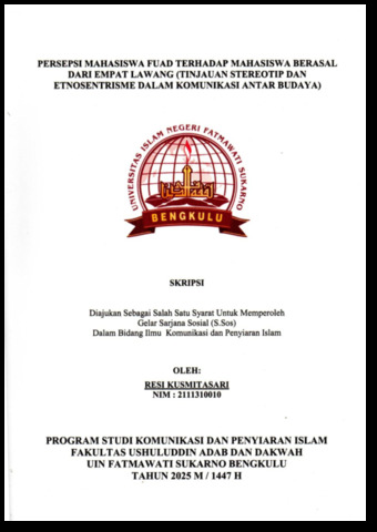 KUSMITASARI, RESI (2025) PERSEPSI MAHASISWA FUAD TERHADAP MAHASISWA BERASAL DARI EMPAT LAWANG (TINJAUAN STEREOTIP DAN ETNOSENTRISME DALAM KOMUNIKASI ANTAR BUDAYA). Undergraduate (S1) thesis, UIN Fatmawati Sukarno Bengkulu.