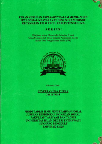 PUTRA, JEVPRI YANSA (2025) PERAN KESENIAN TARI ANDUN DALAM MEMBANGUN JIWA SOSIAL MASYARAKAT DESA SUKA MERINDU KECAMATAN TALO KECIL KABUPATEN SELUMA. Undergraduate (S1) thesis, UIN Fatmawati Sukarno Bengkulu.