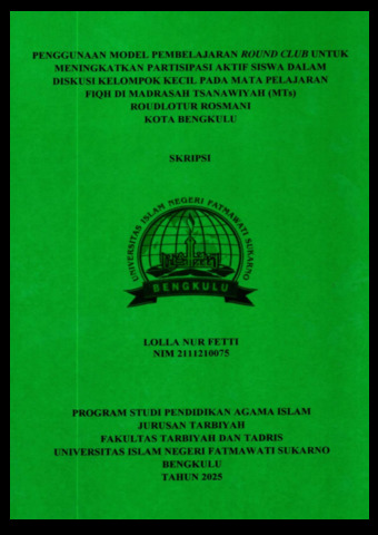 NUR FETTI, LOLLA (2025) PENGGUNAAN MODEL PEMBELAJARAN ROUND CLUB UNTUK MENINGKATKAN PARTISIPASI AKTIF SISWA DALAM DISKUSI KELOMPOK KECIL PADA MATA PELAJARAN FIQH DI MADRASAH TSANAWIYAH (MTs) ROUDLOTUR ROSMANI KOTA BENGKULU. Undergraduate (S1) thesis, UIN Fatmawati Sukarno Bengkulu.