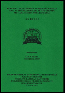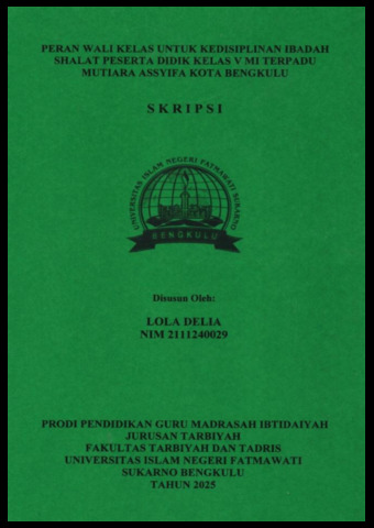 DELIA, LOLA (2025) PERAN WALI KELAS UNTUK KEDISIPLINAN IBADAH SHALAT PESERTA DIDIK KELAS V MI TERPADU MUTIARA ASSYIFA KOTA BENGKULU. Undergraduate (S1) thesis, UIN Fatmawati Sukarno Bengkulu.