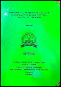 Skripsi ini membahas tentang Penerapan Nilai-nilai Kitab al Akhlak Lil Banin Pada Santri Pondok Pesantren Pancasila Bengkulu. Kajian ini dilatar belakangi oleh santri yang masih belum mengedepankan perilaku akhlakul karimah, belum bisa mengamalkan nilai-nilai yang terdapat pada kitab al akhlak lil banin, serta bagaimana menerapkan pengajaran akhlak melalui nilai-nilai yang terdapat pada kitab al akhlak lil banin. Studi ini dimaksudkan untuk menjawab permasalahan : Bagaimana penerapan nilai-nilai kitab al akhlak lil banin pada santri Pondok Pesantren Pancasila Bengkulu dan bagaimana faktor pendukung dan penghambat penerapan nilai-nilai kitab al akhlak lil banin pada santri Pondok Pesantren Pancasila Bengkulu. Permasalahan tersebut dibahas melalui studi kasus yang dilaksanakan di Pondok Pesantren Pancasila Bengkulu sekaligus dijadikan sebagai sumber data untuk mendapatkan gambaran yang berkaitan dengan penerapan nilai-nilai kitab al akhlak lil banin pada santri Pondok Pesantren Pancasila Bengkulu. Jenis penelitian ini merupakan penelitian kualitatif. Sumber data penelitian adalah Ustadz pengajar kitab al akhlak lil banin. Metode pengumpulan data menggunakan wawancara, observasi, dan dokumentasi. Metode analisis data menggunakan model milles dan hubberman (1984: 246) mengemukakan bahwa aktivitas dalam analisis data kualitatif dilakukan secara interaktif dan berlangsung secara terus menerus sampai tuntas. Aktivitas dalam analisis data meliputi data reduction, data display, conclusion drawing dan verifikasi. Hasil dari penelitian ini dapat disimpulkan bahwa ada beberapa problem yang mengakibatkan santri belum maksimal di dalam beraklakul karimah di lingkungan Pondok Pesantren Pancasila Bengkulu diantaranya : pertama, santri masih ada yang berkata kotor, masih ada santri yang melawan ustadz atau guru, dan masih ada santri yang belum bisa menghormati pelajaran kitab akhlak lil banin diantaranya tidak bawa kitab, datang terlambat, dan suka tidur di kelas. Hal tersebut dikarenakan tidak xii adanya rasa kesadaran diri santri, tidak adanya motivasi dari diri santri dan tidak adanya kemauan untuk belajar kitab al akhlak lil banin. Penerapan Nilai-nilai Kitab al Akhlak Lil Banin Pada Santri Pondok Pesantren Pancasil Bengkulu adalah pertama guru atau ustadz Sebagai mediator dalam belajar akhlak, bertujuan untuk memberikan motivasi, dorongan serta dukungan kepada santri dalam masalah belajar akhlak. Kedua untuk mengedepankan akhlak santri, bertujuan untuk membantu santri agar berakhlakul karimah, serta menerapkan dan mengamalkan apa yang terdapat di dalam materi kitab al akhlak lil banin termasuk nilai-nilai yang terkandung di dalamnya. Adapun faktor pendukung dan penghambatnya ialah faktor internal yaitu faktor dari dalam diri santri sendiri atau faktor bawaan, kedua faktor eksternal atau faktor lingkungan yaitu faktor yang terdapat dari lingkungan luar atau lingkungan bermain.