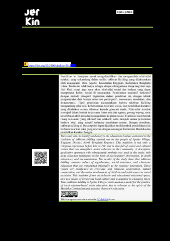 This study aims to identify and analyze the educational values contained in the tradition of takbiran keliling carried out by the people of Apoho Village, Enggano District, North Bengkulu Regency. This tradition is not only a religious expression before Eid al-Fitr, but is also full of social and cultural values that can strengthen social cohesion in the community. A descriptive qualitative approach with ethnographic methods was used in this study, with data collection techniques in the form of participatory observation, in-depth interviews, and documentation. The results of the study show that takbiran keliling contains values of togetherness, social tolerance, and character education that are transmitted informally to the younger generation. These values are manifested in cross-age and religious cooperation, mutual cooperation, and the active involvement of children and adolescents in social activities. This tradition forms an inclusive and educational relational space, and is a means of preserving local culture that is adaptive to changing times. Thus, takbiran keliling in Apoho Village can be used as a model for the practice of local wisdom-based value education that is relevant to the spirit of the Merdeka Curriculum and national character education.