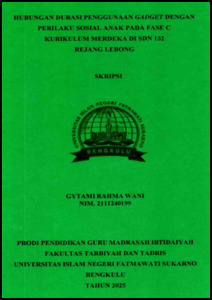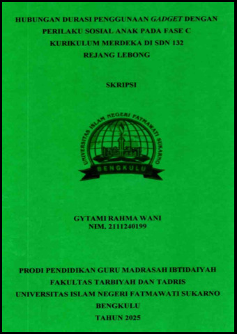 WANI, GYTAMI RAHMA (2025) HUBUNGAN DURASI PENGGUNAAN GADGET DENGAN PERILAKU SOSIAL ANAK PADA FASE C KURIKULUM MERDEKA DI SDN 132 REJANG LEBONG. Undergraduate (S1) thesis, UIN Fatmawati Sukarno Bengkulu.