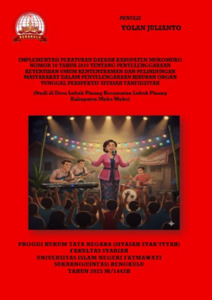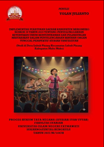 JULIANTO, YOLAN (2025) IMPLEMENTASI PERATURAN DAERAH KABUPATEN MUKOMUKO NOMOR 10 TAHUN 2019 TENTANG PENYELENGGARAAN KETERTIBAN UMUM KENTENTRAMAN DAN PELINDUNGAN MASYARAKAT DALAM PENYELENGARAAN HIBURAN ORGAN TUNGGAL PERSPEKTIF SIYASAH TANFIDZIYAH (Studi di Desa Lubuk Pinang Kecamatan Lubuk Pinang Kabupaten Muko Muko). Undergraduate (S1) thesis, UIN Fatmawati Sukarno Bengkulu.