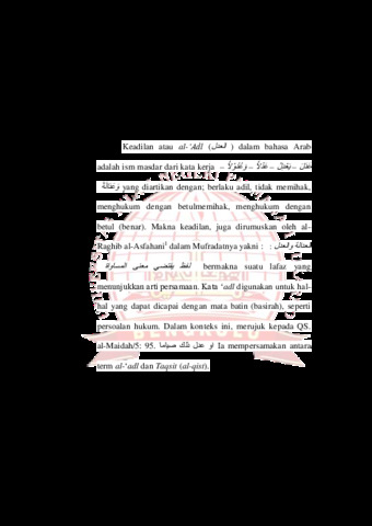 Penelitian ini latar belakang oleh pentingnya konsep al-ʿadl sebagai prinsip dasar keadilan yang mengatur hubungan manusia dengan Allah dan sesama manusia.pada tiga permasalahan utama, yaitu pertama,bagaimana makna term ʿadl dalam Al-Qur‟an menurut,kedua bagaimana penafsiran ayat-ayat yang mengandung kata Al-ʿAdl menurut Tafsir Al-Misbah, dan ketiga bagaimana makna term Al-„Ad menurut Tafsir Al-Misbahl. Metode penelitian yang digunakan adalah penelitian kualitatif dengan pendekatan tafsir tematik (maudhu„i), dengan sumber data primer berupa Tafsir Al-Misbah dan data sekunder dari literatur yang relevan. Analisis dilakukan dengan menelusuri ayat-ayat yang mengandung kata ʿadl dan mengkaji penafsiran Quraish Shihab secara mendalam. Hasil penelitian Pertama,menurut Kata Term Al-„Adl dalam Al Qur‟an adalah Kata adil di dalam berbagai bentuknya terulang sebanyak 28 kali di dalam Al-Qur„an.Kata Al-„adl sendiri disebutkan 13 kali, yakni pada QS. AlBaqarah: 48, 123, dan 282 (dua kali), QS. An-Nisa„: 58, QS. Al-Ma„idah: 95 (dua kali) dan 106, QS. Al-An‟am: 70, QS. AnNahl: 76 dan 90, QS. Al-Hujurat: 9, serta QS. Ath-Thalaq: 2,Kedua, Penafsiran Menurut Tafsir Misbah M. Quraish Shihab menafsirkan ʿadl sebagai penempatan sesuatu pada tempatnya yang tepat, menegakkan keadilan, serta menjauhi segala bentuk kezaliman. Penafsiran beliau bersifat kontekstual dan aplikatif, sehingga relevan untuk kehidupan modern, dan Ketiga, Makna ʿAdl dalam Al-Qur‟an,Kata AlʿAdl (عدل (dalam Al-Qur‟an memiliki makna yang luas, di antaranya kesamaan, keseimbangan, pemberian hak sesuai porsi, dan sifat Allah sebagai Al-„Adl.