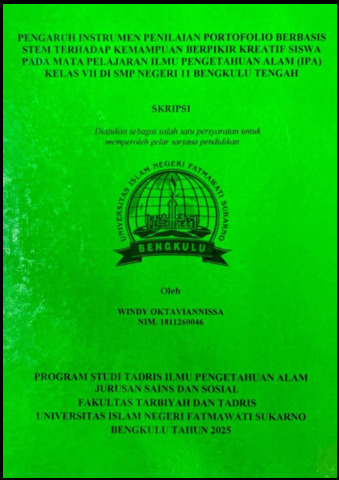 OKTAVIANNISSA, WINDY (2025) PENGARUH INSTRUMEN PENILAIAN PORTOFOLIO BERBASIS STEM TERHADAP KEMAMPUAN BERPIKIR KREATIF SISWA PADA MATA PELAJARAN ILMU PENGETAHUAN ALAM (IPA) KELAS VII DI SMP NEGERI 11 BENGKULU TENGAH. Undergraduate (S1) thesis, UIN Fatmawati Sukarno Bengkulu.
